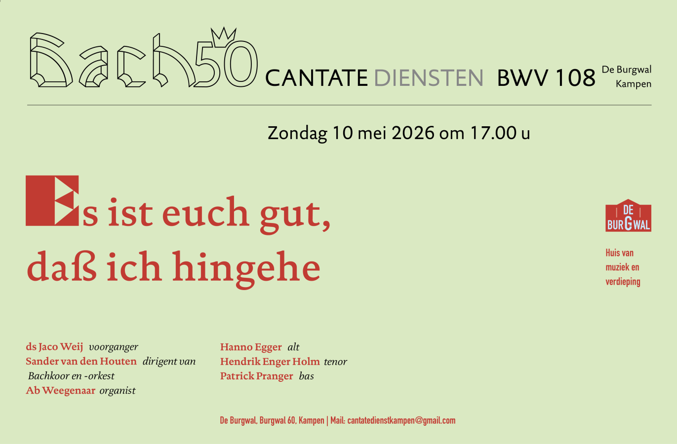 | Medewerkenden: | Op 10 mei 2026 wordt om 17.00 u in de cantatedienst in De Burgwal, Burgwal 60 te Kampen Es ist euch gut, daß ich hingehe BWV 108 uitgevoerd. Het Bachkoor en - orkest staan onder leiding van Sander van den Houten. Ab Wegenaar bespeelt het Zwier van Dijkorgel en als solisten werken mee Hanno Egger alt, Henrik Enger Holm tenor en Patrick Pranger bas. Voorganger in deze dienst is ds Jaco Weij, predikant. |